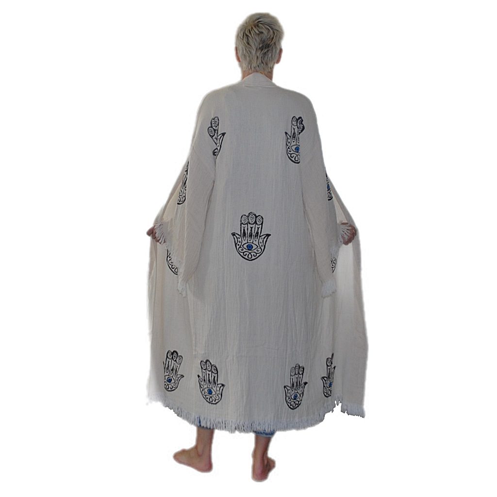 Deze prachtige hand gestempelde badjassen zijn geweven met een 60/40% bamboe/katoen mix. Ze is ideaal als zomer of sauna badjas. Maar leent zich ook héél goed als trendy kaftan op een stoere jeans of tuinbroek.