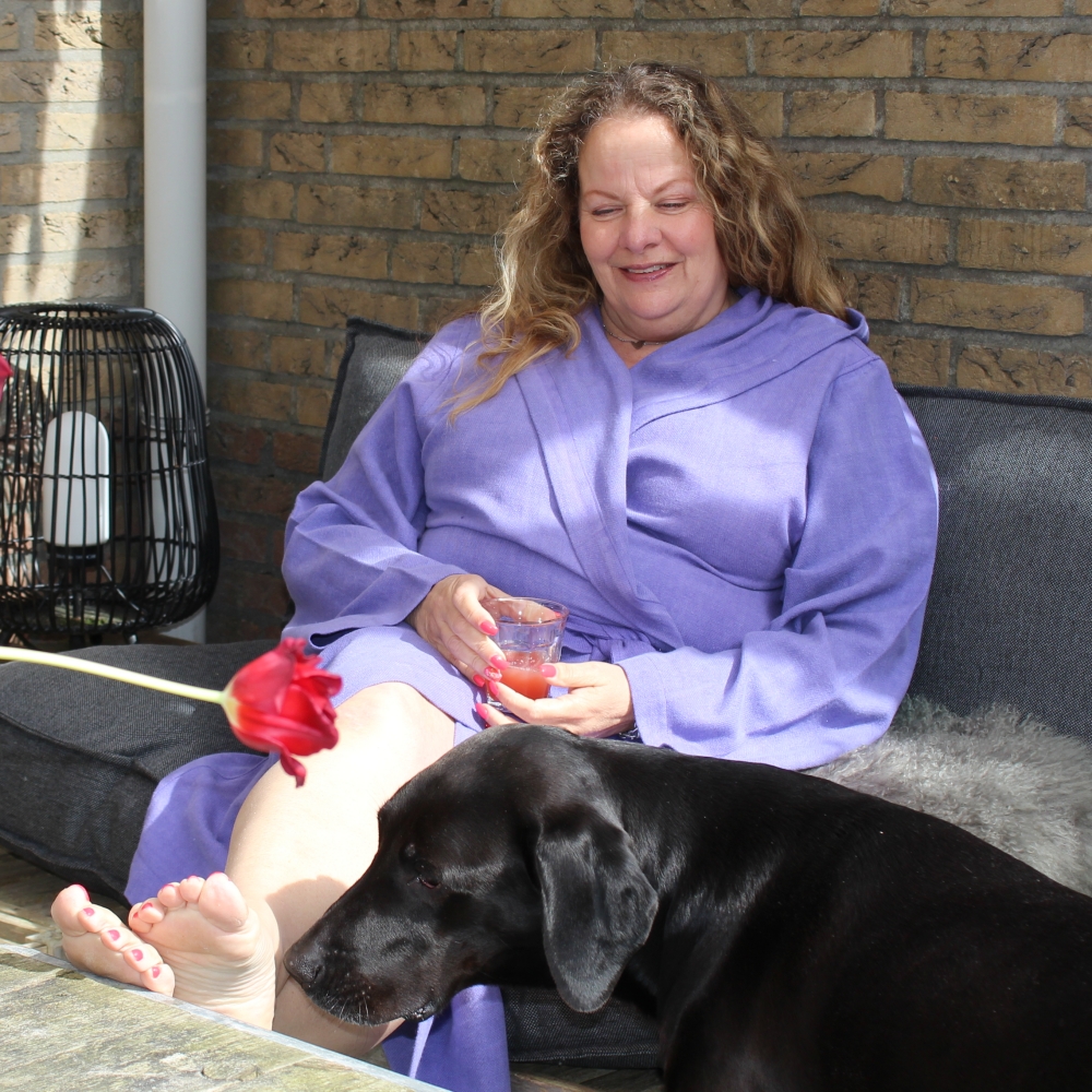 Badjas Tine is een zelf ontworpen badjas met capuchon, voor dames met maten vanaf maat 46 t/m 60. Door de soepel- en ruimvallende pasvorm draagt deze badjas comfortabel en kun je je 100% veilig voelen. Het model valt losjes over de knie.