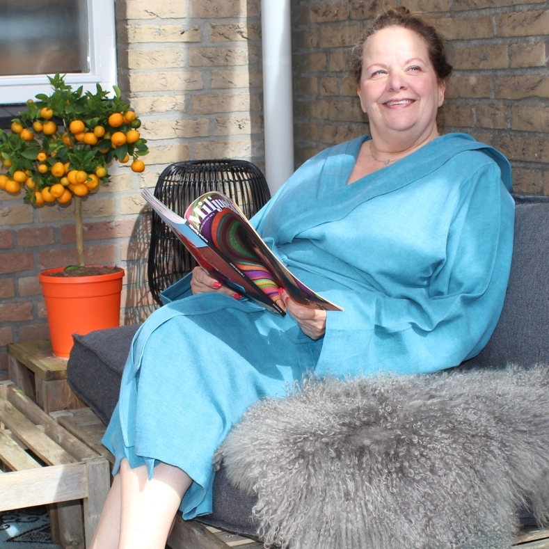 Badjas Tine is een zelf ontworpen badjas met capuchon, voor dames met maten vanaf maat 46 t/m 60. Door de soepel- en ruimvallende pasvorm draagt deze badjas comfortabel en kun je je 100% veilig voelen. Het model valt losjes over de knie.